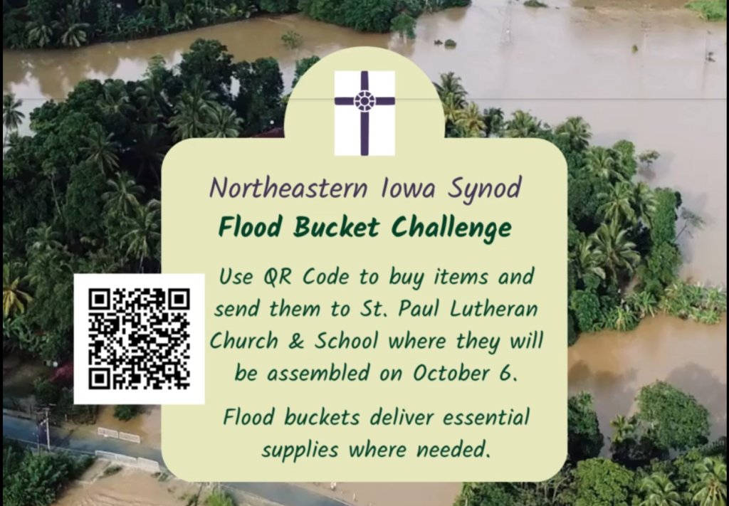 St. Paul Lutheran and Wartburg College of Waverly, along with Faith Lutheran of Shell Rock, are collecting cleaning supplies to assemble flood buckets on Oct. 6, 2024. A list of needed supplies has been set up on Amazon, where people can purchase items and have them delivered directly to St. Paul Lutheran (301 1st St NW, Waverly, IA 50677), where the buckets will be assembled.